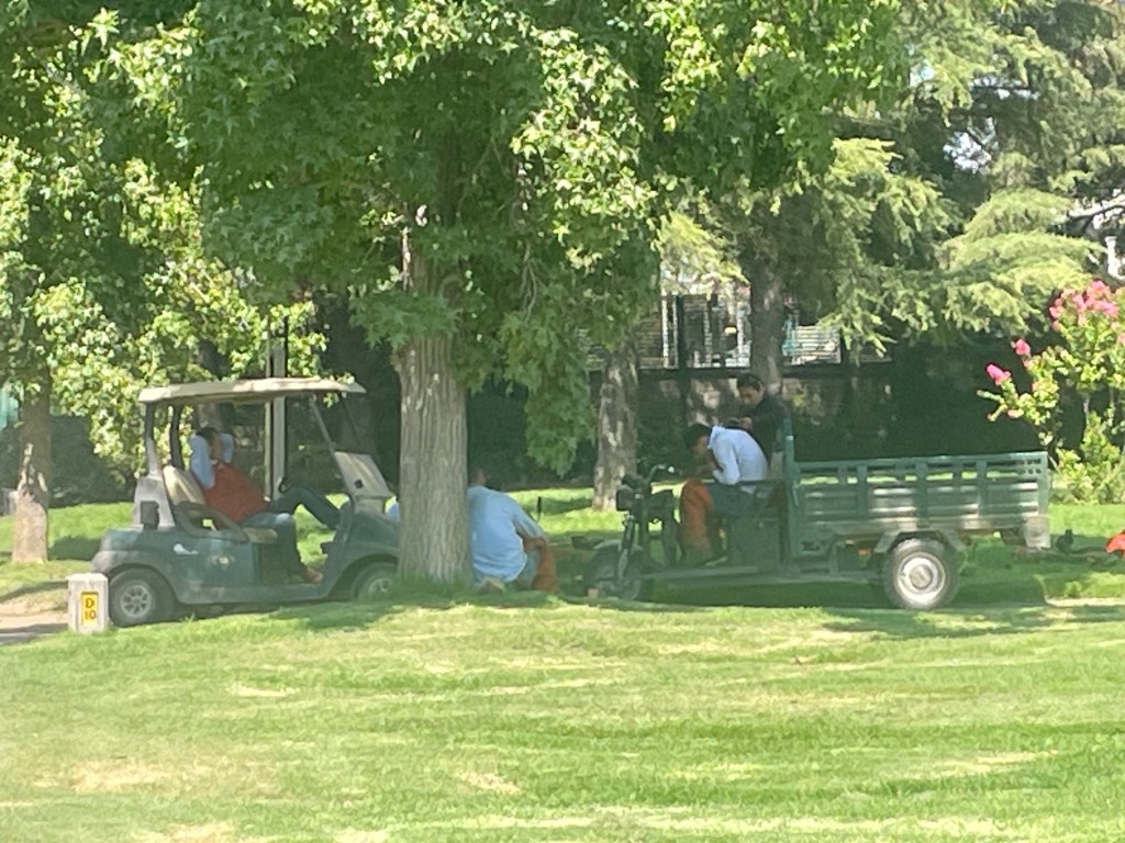 -Trabajadores que debiendo efectuar lo anterior están en grupos sentados todos con sus celulares a las 11:30 am.